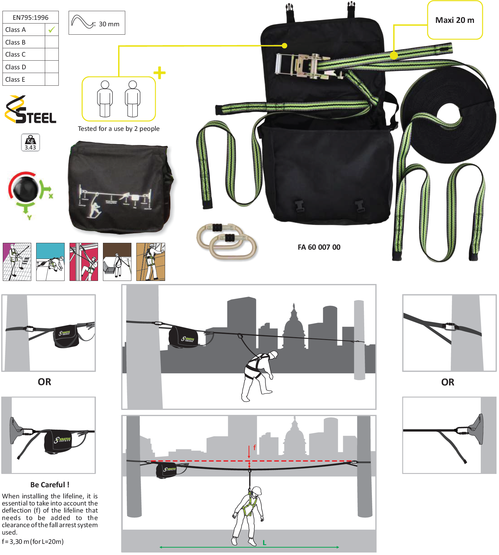 When installing the lifeline, it is essential to take into account the deflection (f) of the lifeline that needs to be added to the