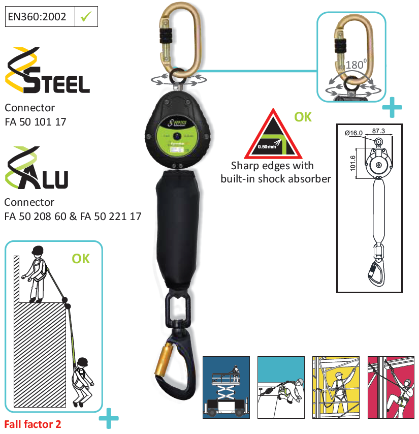 Comes with a screw-locking karabiner and a swivel at anchorage end, and a quarter turn-locking hook with swivel at attachment end.