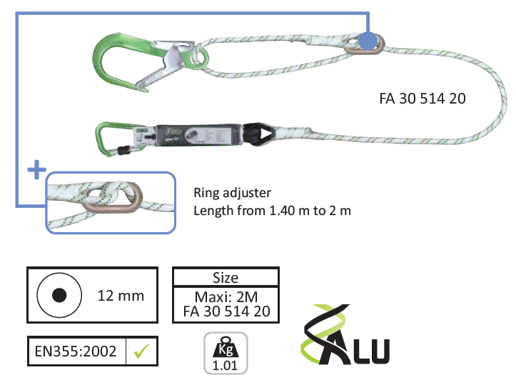 - Energy absorber in 35 mm wide webbing, which reduces the impact of the fall to less than 6 kN,