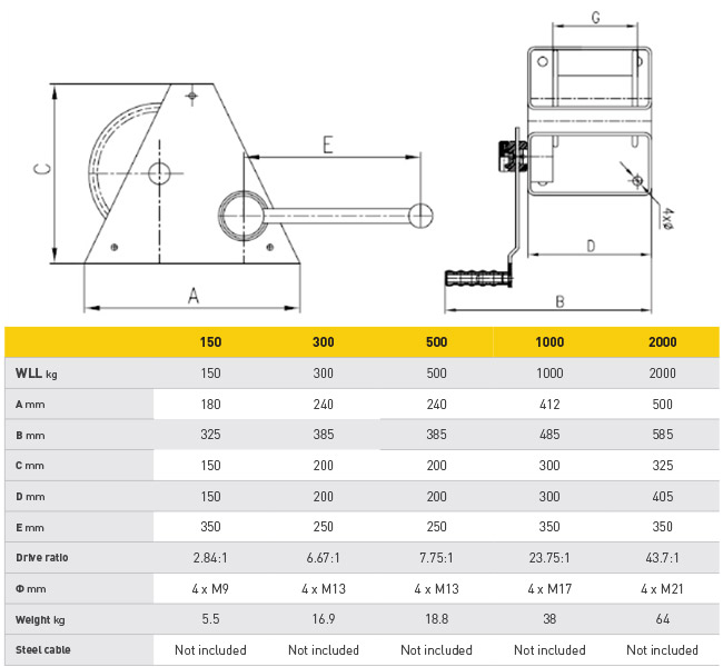 The manual hand winches are designed for lifting and hoisting heavy objects. Super strong and made from high quality steele. The hand winches come standard with an automatic break, this prevents the steel cable from detaching under load. The manual hand winches can be mounted horizontally or vertically depending on usage. The handlebar is easy to remove and can be adjusted in heights.