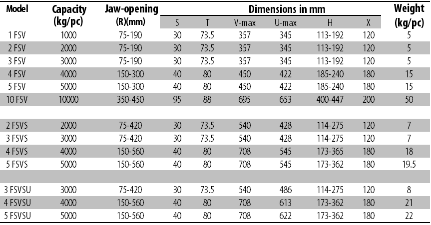 • FSVS / FSVSU types are supplied with enlarged jaw opening: 75 to 560 mm