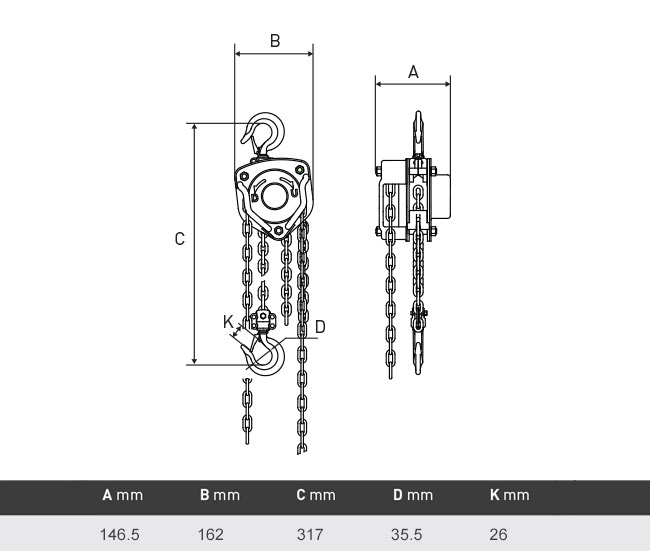 Chain hoists with a heavy operation hide a lesser quality chain hoist which do the work instead of the chain hoist. Furthermore, the chain hoist hoist on galvanized chain, hardened pocketed wheel, chain guide rollers instead, sturdy molded valves (instead of a tin cover). All axles are mounted, metal powder coated housing. Swiveling lower hook- and top hook. A rock-solid chain hoist for years of professional hoisting fun. Liftinggear-Shop provides this chain hoists with the desired chain length from stock (default is 3 m. + 2 m. Height control).
