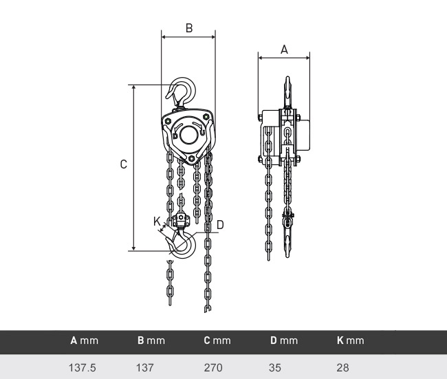 Chain hoists with a heavy operation hide a lesser quality chain hoist which do the work instead of the chain hoist. Furthermore, the chain hoist hoist on galvanized chain, hardened pocketed wheel, chain guide rollers instead, sturdy molded valves (instead of a tin cover). All axles are mounted, metal powder coated housing. Swiveling lower hook- and top hook. A rock-solid chain hoist for years of professional hoisting fun. Liftinggear-Shop provides this chain hoists with the desired chain length from stock (default is 3 m. + 2 m. Height control).