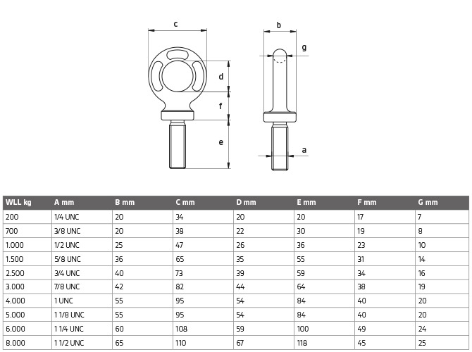 The eye bolts are made of grade 80 alloy steel, apart from the forged welding base of the PAS, which is made of welding quality steel. Compared to the DIN 580 and 582 carbon steel lifting eyes, the alloy steel lifting eyes offer a higher Working Load value for an equivalent size.