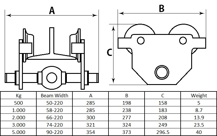 The Liftinggear trolleys are the most used trolleys which are currently for sale. First, these trolleys have a spindle. So no more hassle with filler rings. The trolley can be simply placed by one person. The locking of the trolley can be accomplished by placing a hoist. The spindle can therefore not come loose or vibrate loose, always a perfect assurance. Usable for various beam widths. Fine thread on the spindle. Liftinggear trolleys are fitted with ball bearing wheels for smooth transporting loads. All trolleys are provided (statutory) wheel fracture support.